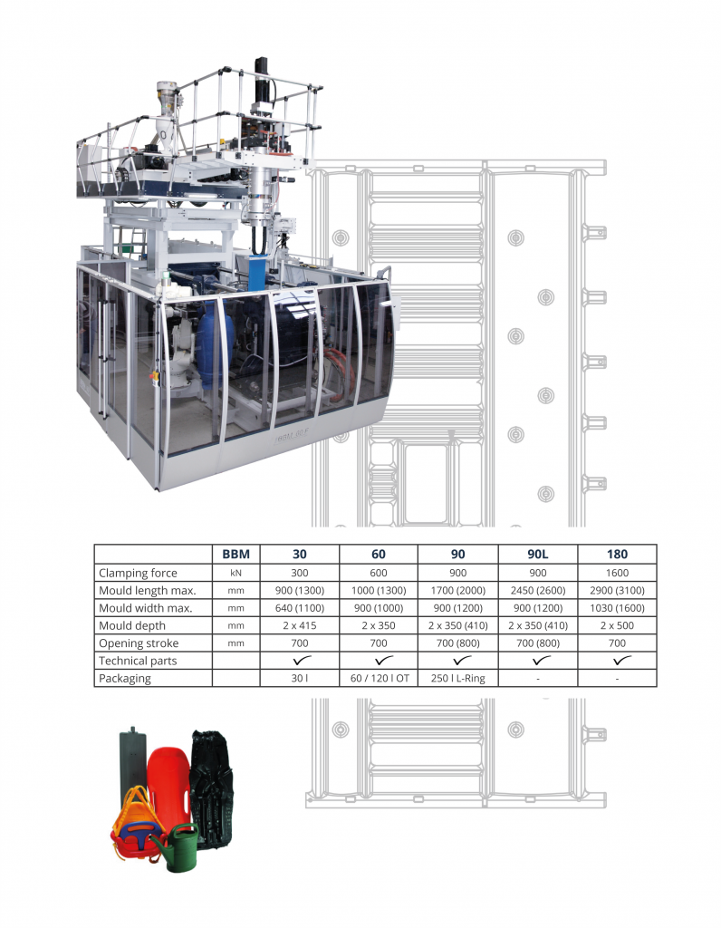 Mittelgroße und kompakte Blasformmaschinen mit feststehendem 3-Platten-Spannsystem für technische Teile verschiedenster Größen